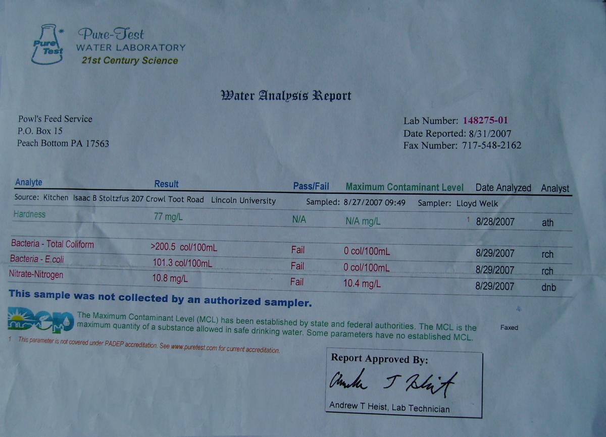 Isaac Stoltzfus in Pennsylvania needed to get his bakery USAD certified, he had a test done prior to installing the Vortex Water Revitalizer, which he failed. After installing the Vortex Water Revitalizer he passed and was able to get certified. The results from the bacteria lab tests that were done before and after the installation of the Vortex Water Revitalizer are displayed below.